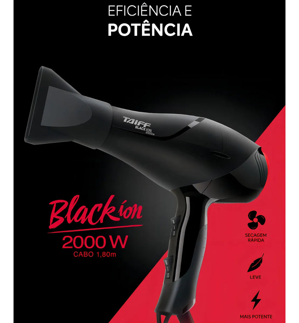 Seja para criar ondas glamourosas, definir cachos ou conquistar aquele liso impecável, o Secador Taiff Black Ion 2000W é o seu novo aliado de beleza.